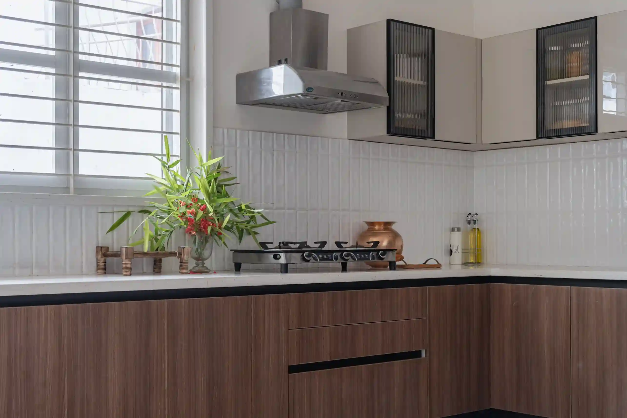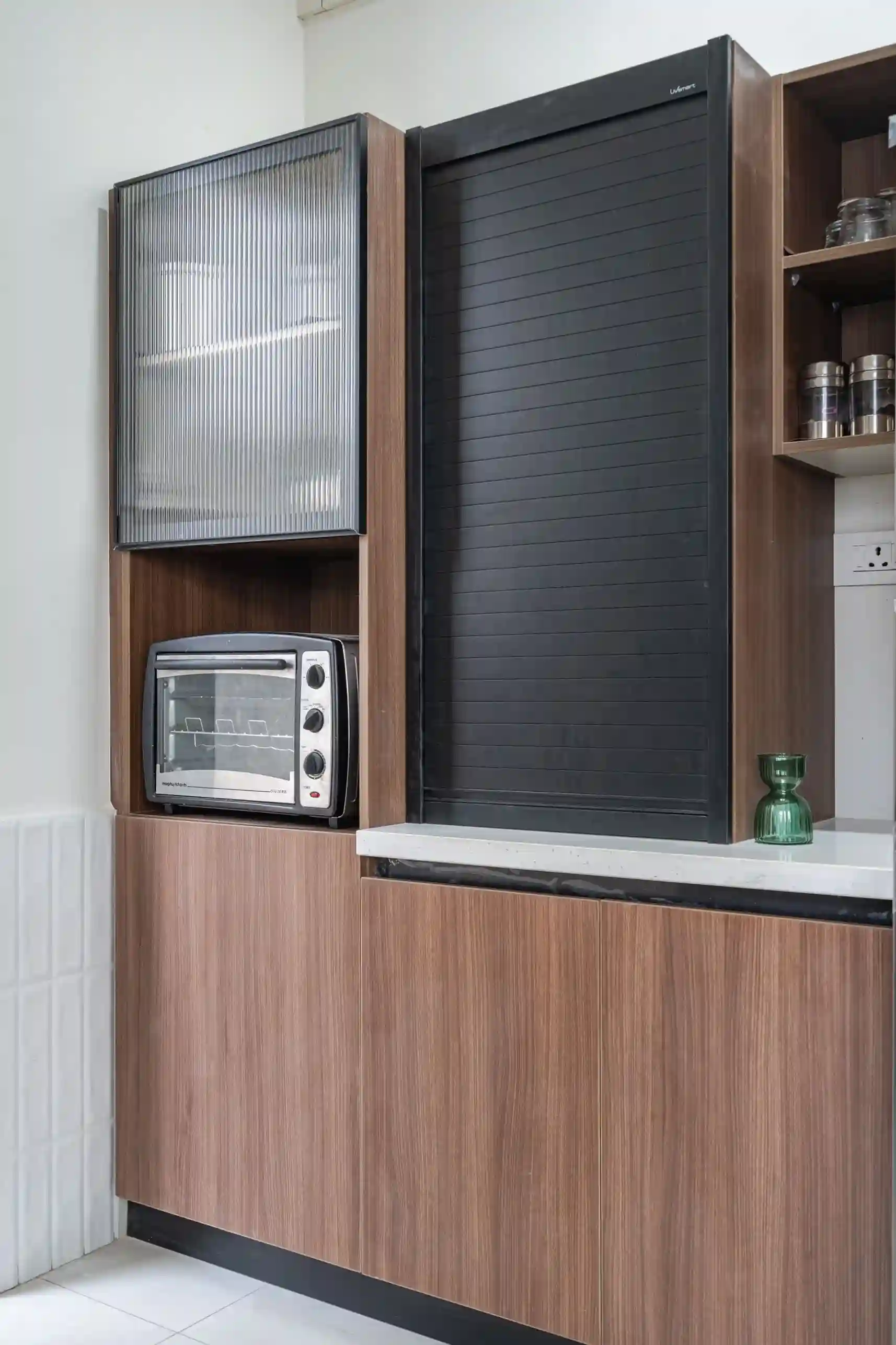 This project is curated in such a way to the client that it is functional and streamlined, using a mix of materials wood, black texture, and reeded glass to create a sophisticated, highly organized storage solution and space planing which is ideal for a compact and modern home.